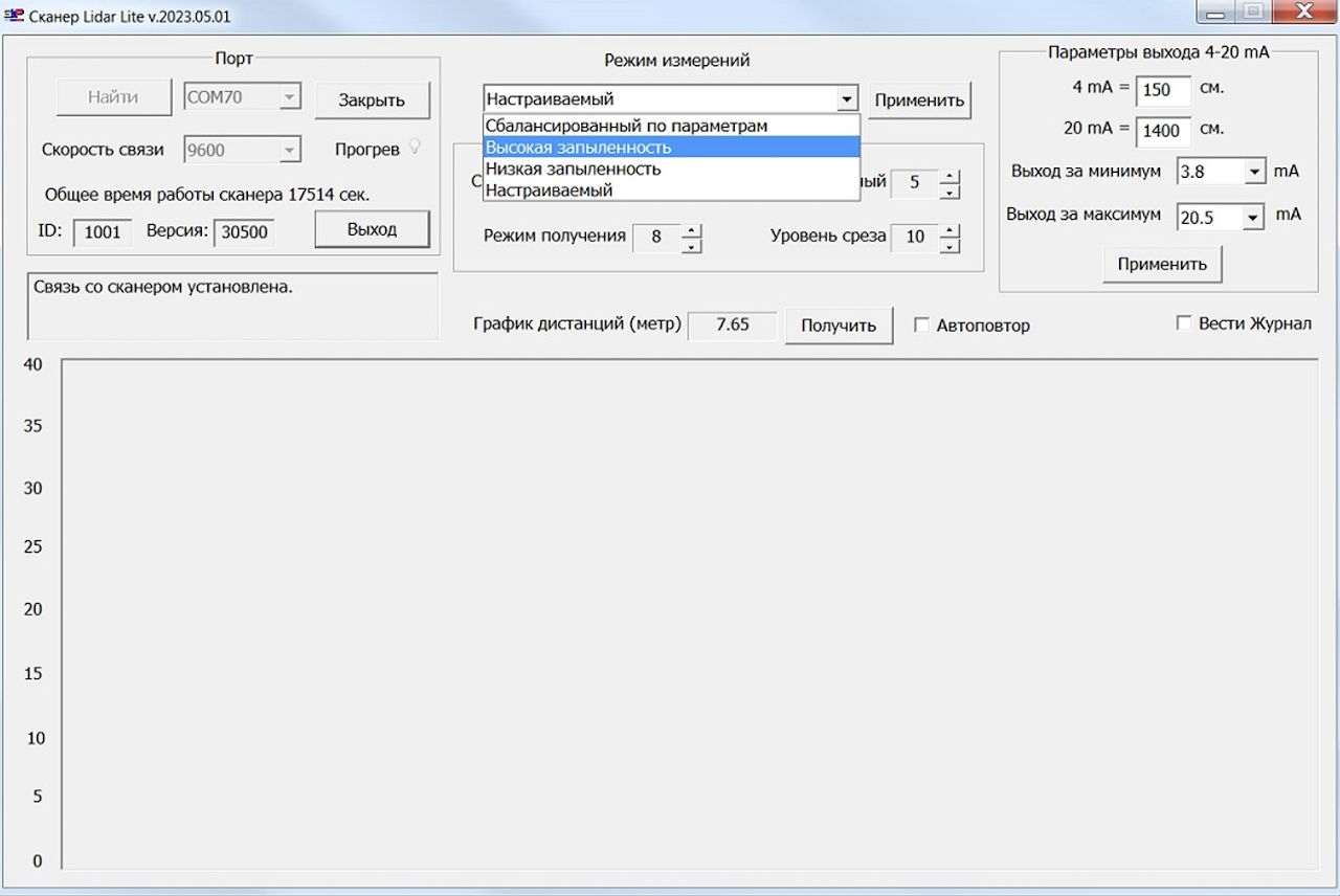 Программное обеспечение поставляется в комплекте с лазерным уровнемером. Через нее настраиваются параметры работы лазера, выставляется необходимый диапазон аналогового вывода, а так же сохраняется история измерений для анализа и отчетности. Есть возможность отслеживать показания без задержек в реальном времени.